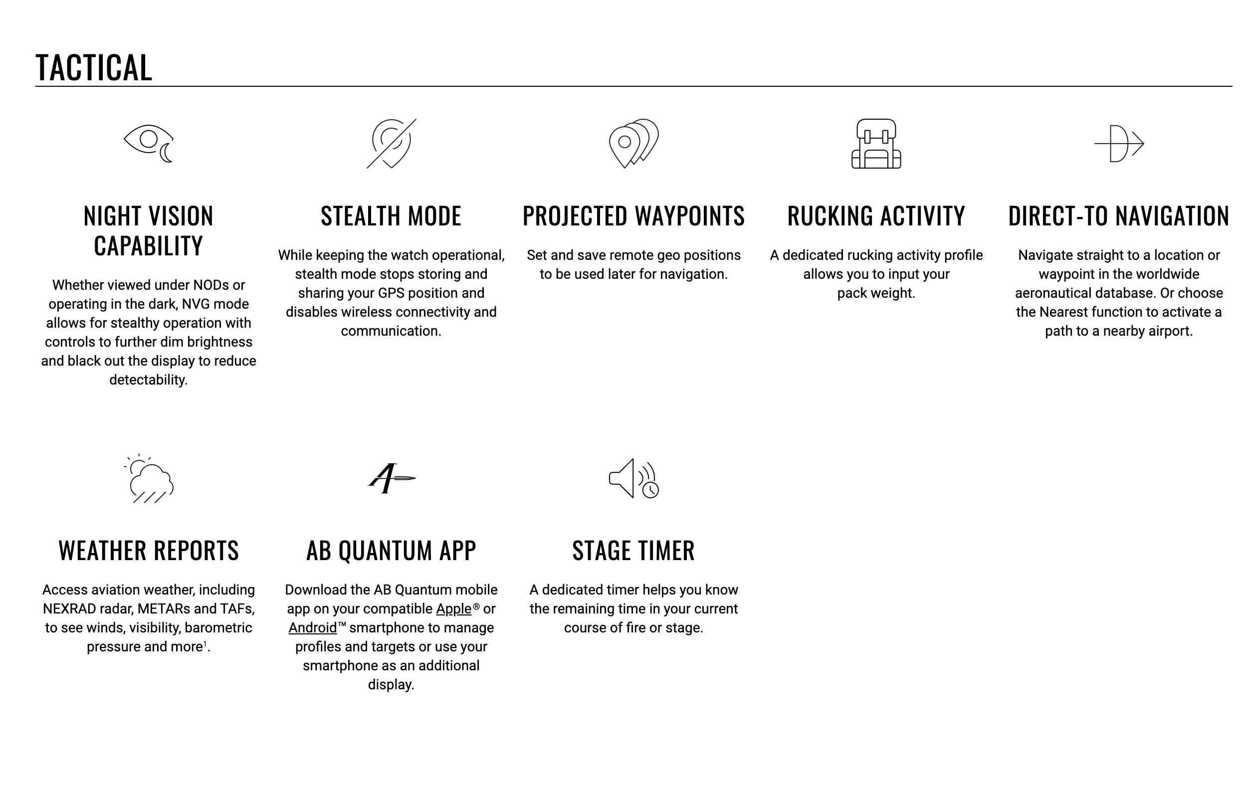 DEDICATED TACTICAL FEATURES SUCH AS RUCKING ACTIVITY AND APPLIED BALLISTICS® SOLVER